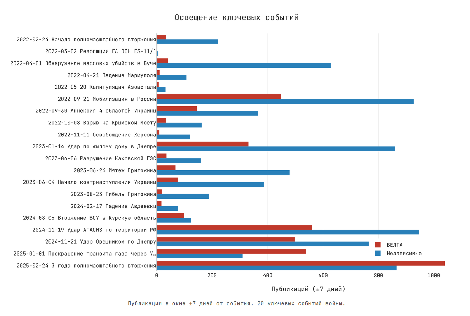 График ключевых событий показывает паттерн выборочности: БЕЛТА покрывает мобилизацию в России (447 публикаций), но почти игнорирует освобождение Херсона (9 против 121). Прекращение транзита газа (539 публикаций) — единственное событие, где БЕЛТА лидирует: это экономический нарратив, который можно контролировать.