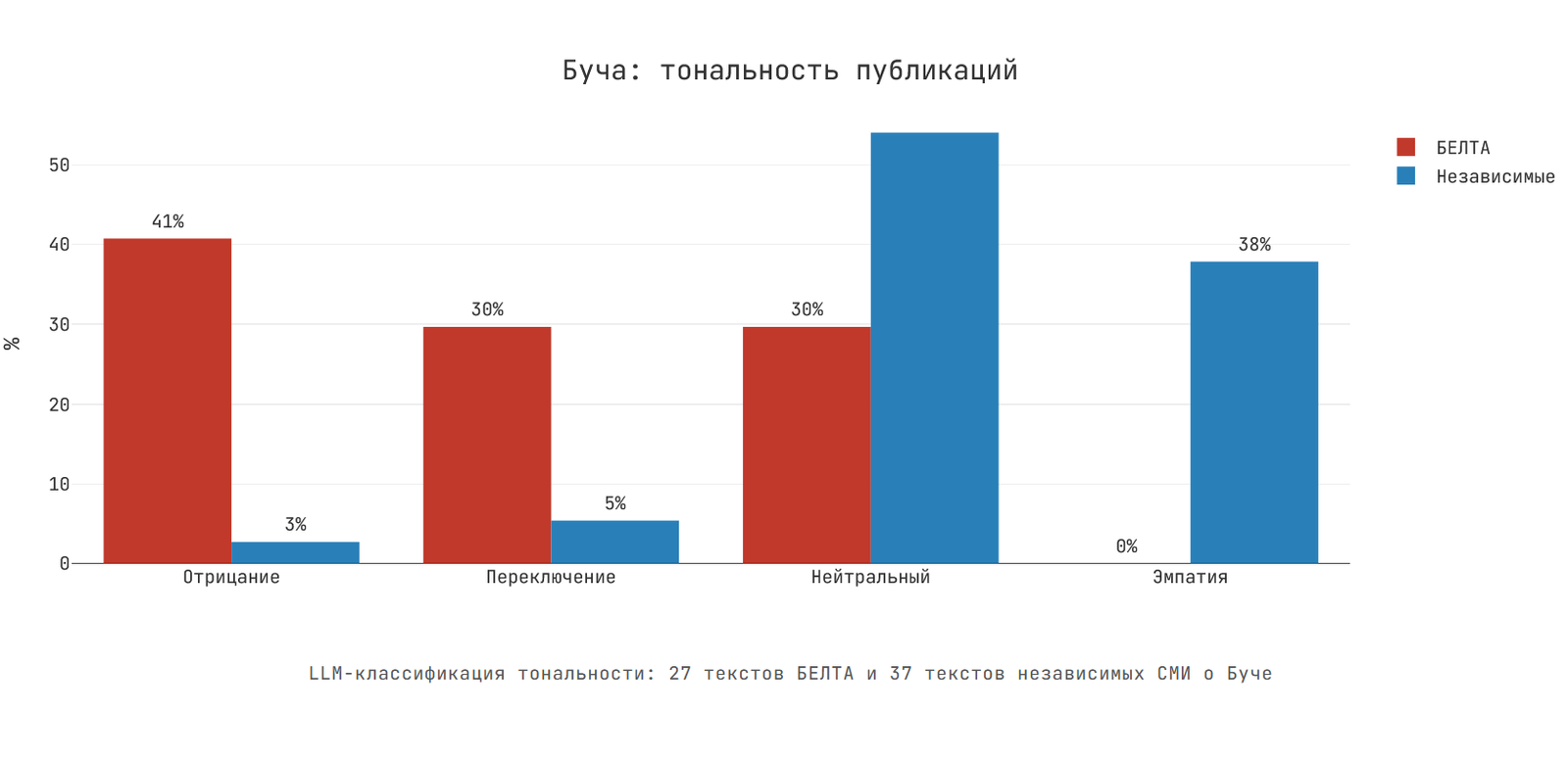 71% публикаций БЕЛТА о Буче используют тон отрицания (41%) или переключения внимания (30%). Ни одна публикация не выражает сочувствия жертвам. 67% используют фрейм «пропагандистское заявление». У независимых — зеркальная картина: 38% выражают эмпатию, 35% квалифицируют как военное преступление.