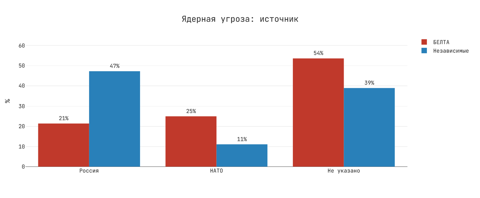 В текстах о ядерной угрозе БЕЛТА размывает источник: 54% текстов не указывают, кто угрожает, а 25% прямо перекладывают ответственность на НАТО. Независимые чётко называют Россию источником в 47% случаев.