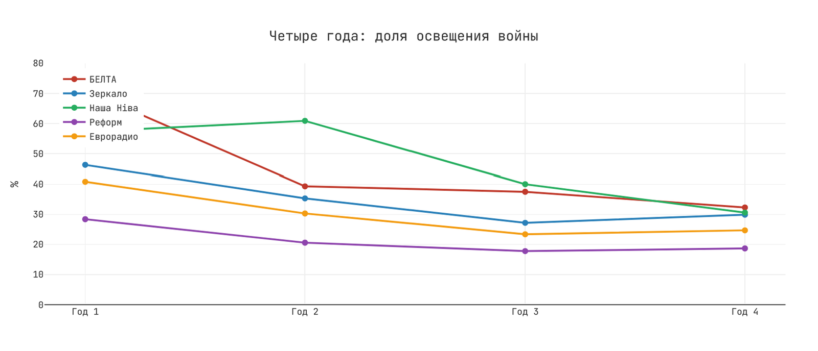 Год 3 — Рутинизация (38%): Война становится фоном. Независимые медиа также снижают долю покрытия.