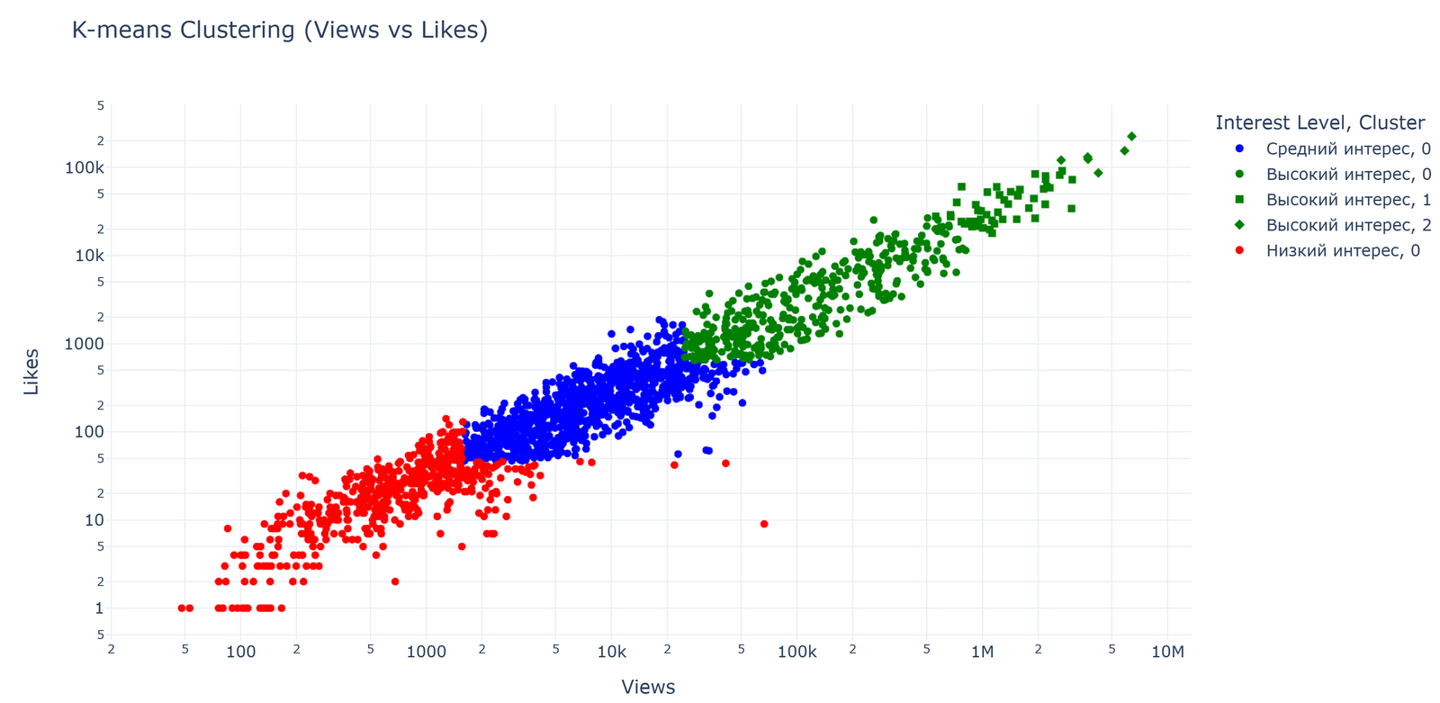 Определение кластеров: График, вероятно, показывает распределение объектов (например, постов) по числу просмотров и лайков, разделенное на несколько кластеров. Каждый кластер обозначает группу постов с похожими характеристиками в терминах просмотров и лайков.