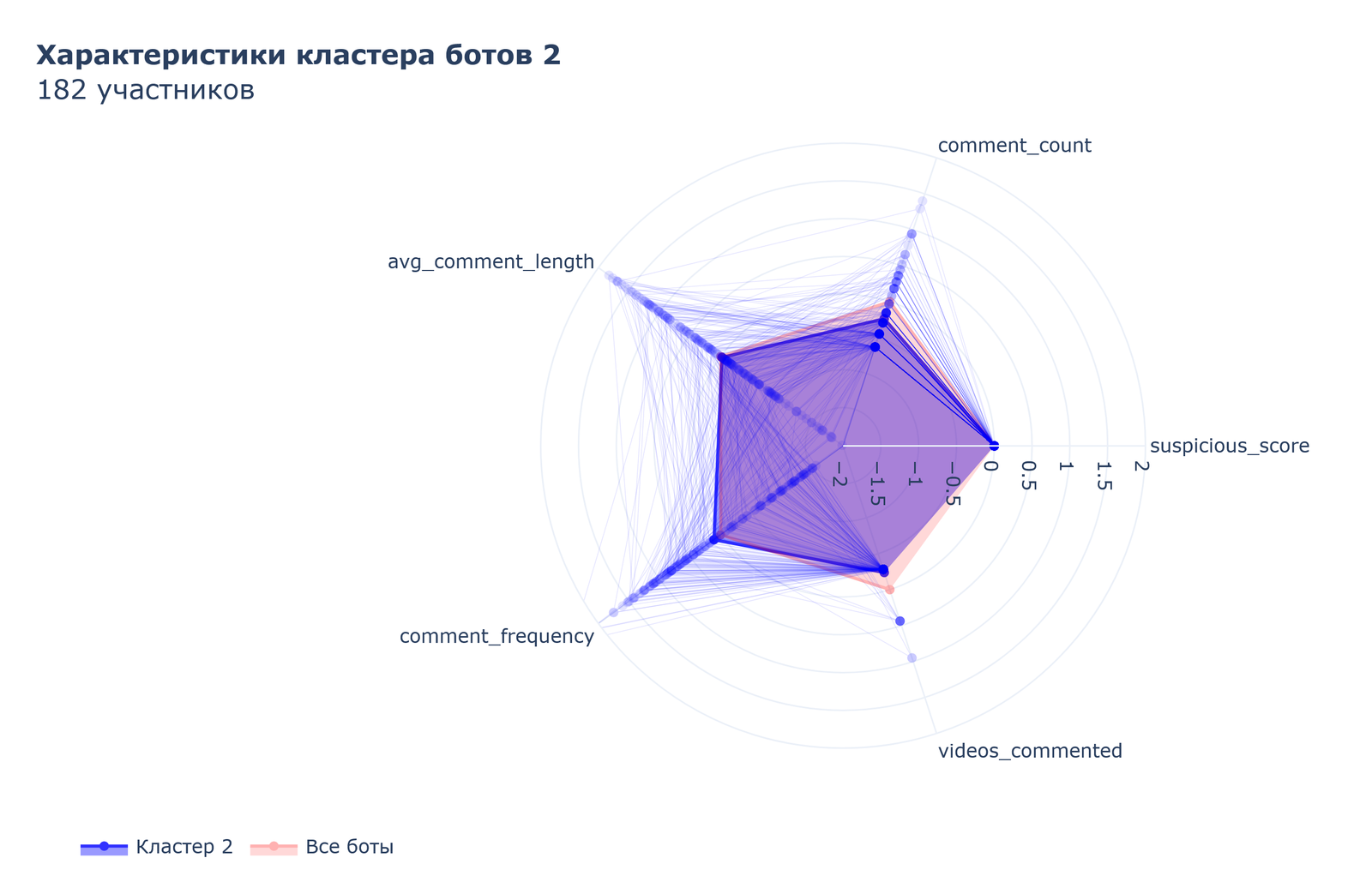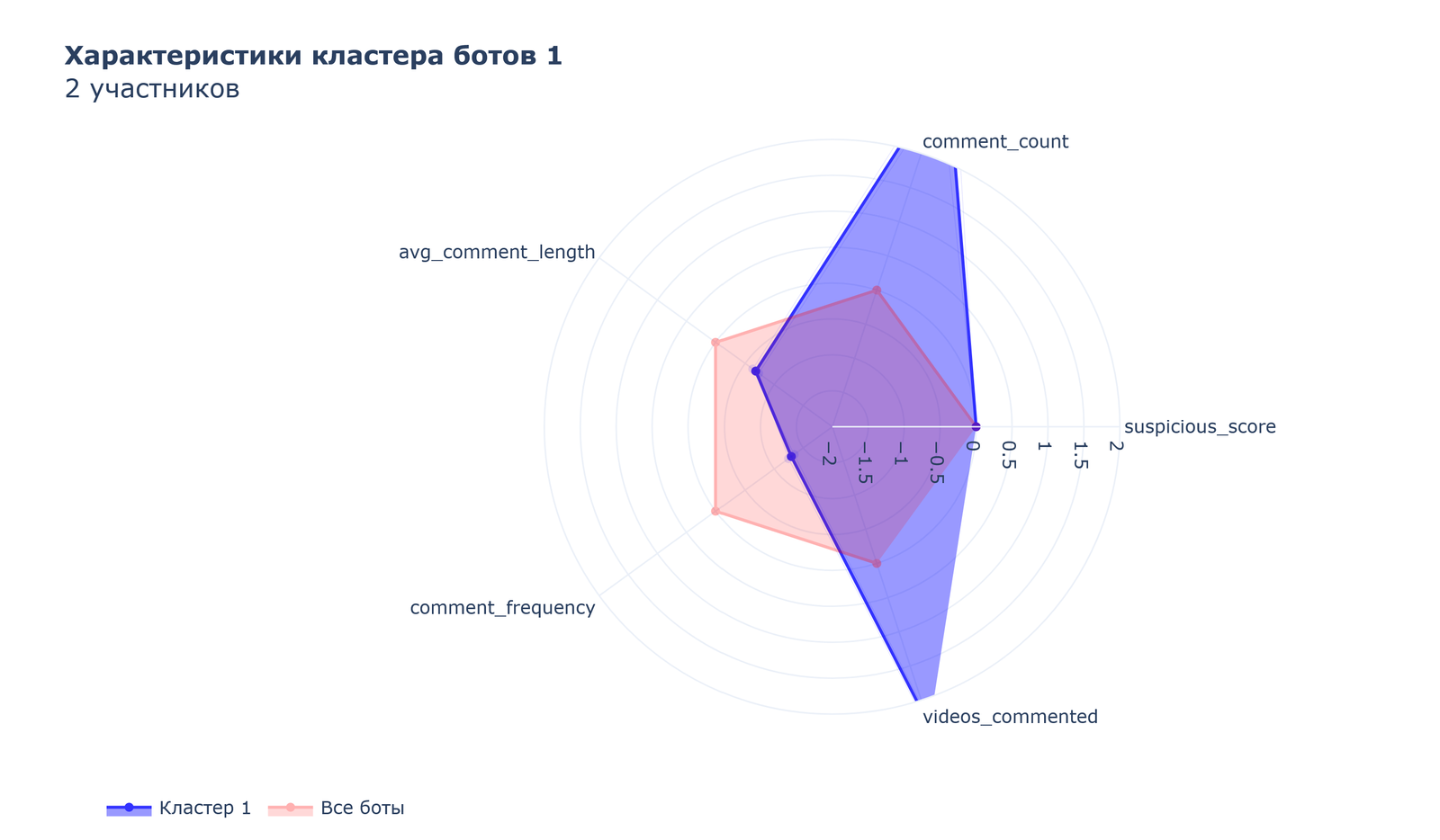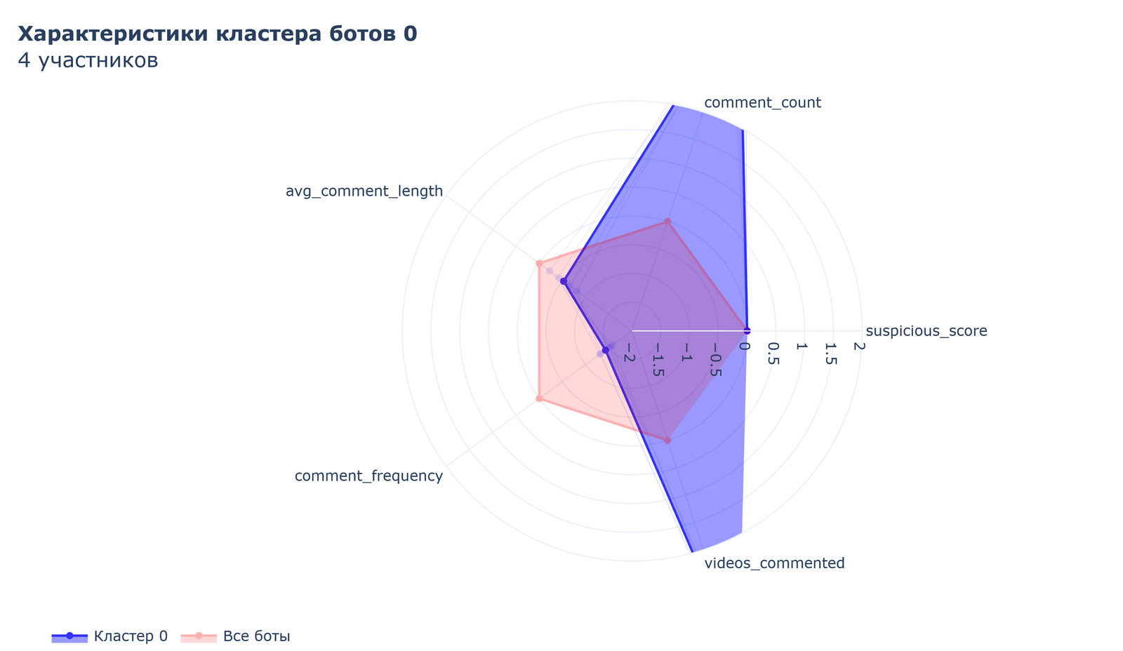 Кластер 0, насчитывающий 4 участника, представляет собой «ботов широкого охвата» с высокими показателями количества комментариев и числа прокомментированных видео.