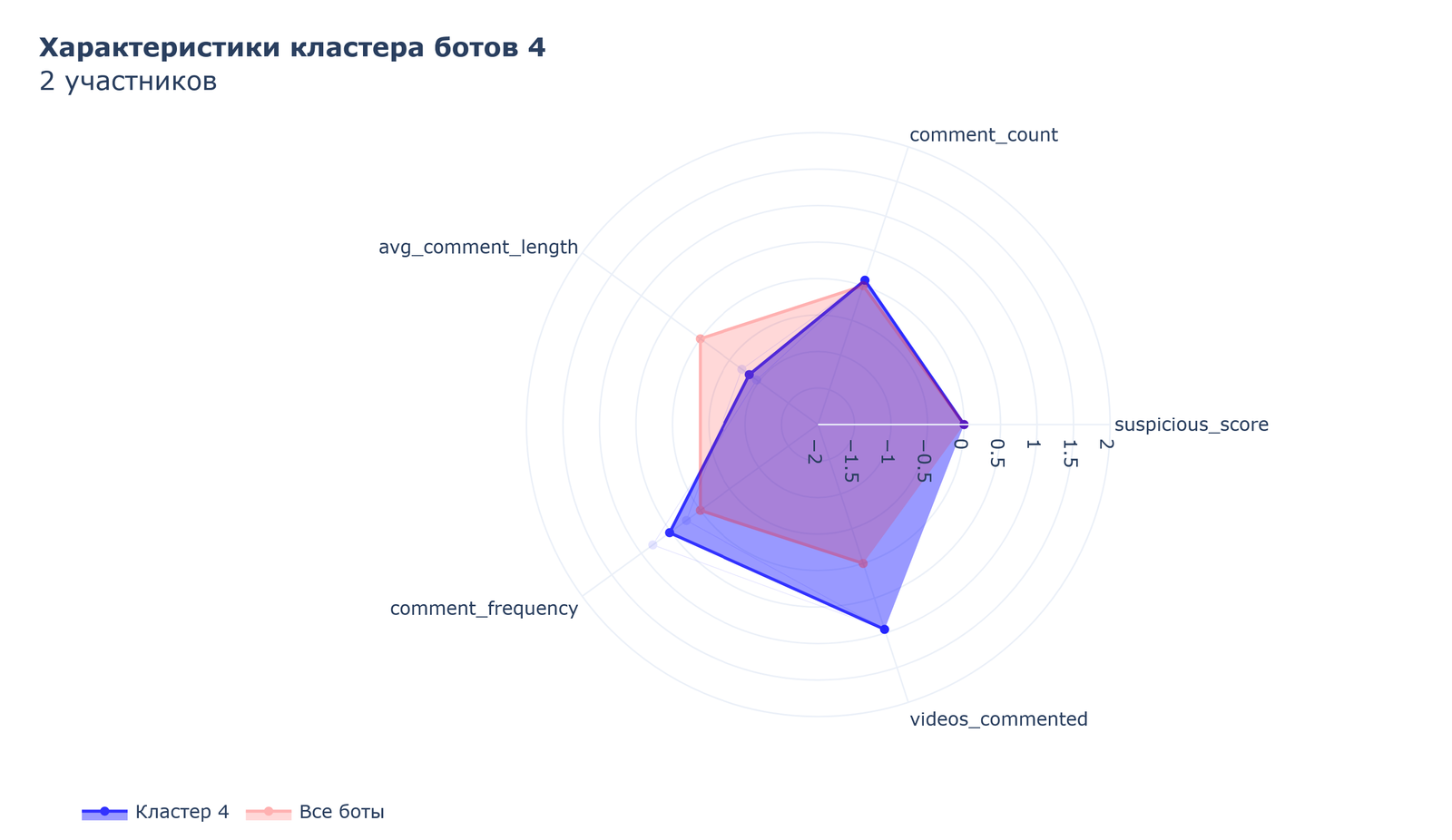 Кластер 4, также состоящий из 2 участников, действует как группа «спамеров» с наиболее явными признаками автоматизации, высокой частотой комментирования и значительным охватом видео.