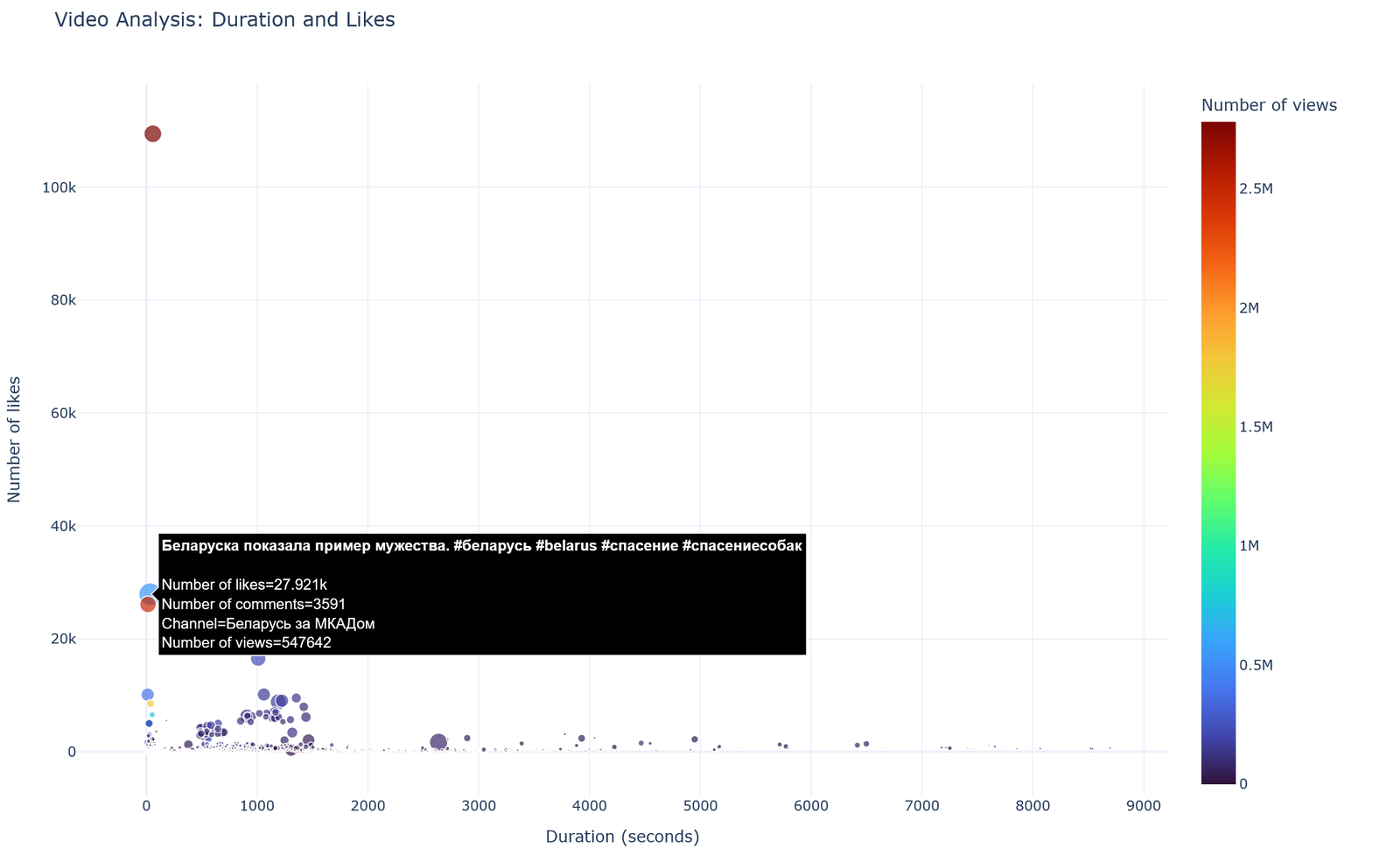 Анализ графика вовлеченности, где отображены продолжительность видео, количество лайков, просмотров и комментариев, показывает, что основная масса контента имеет продолжительность до 2000 секунд и относительно невысокие показатели вовлеченности. Заметна также кластеризация видео продолжительностью от 500 до 1500 секунд с повышенной комментаторской активностью, что может указывать на оптимальную длительность для стимулирования дискуссии.
