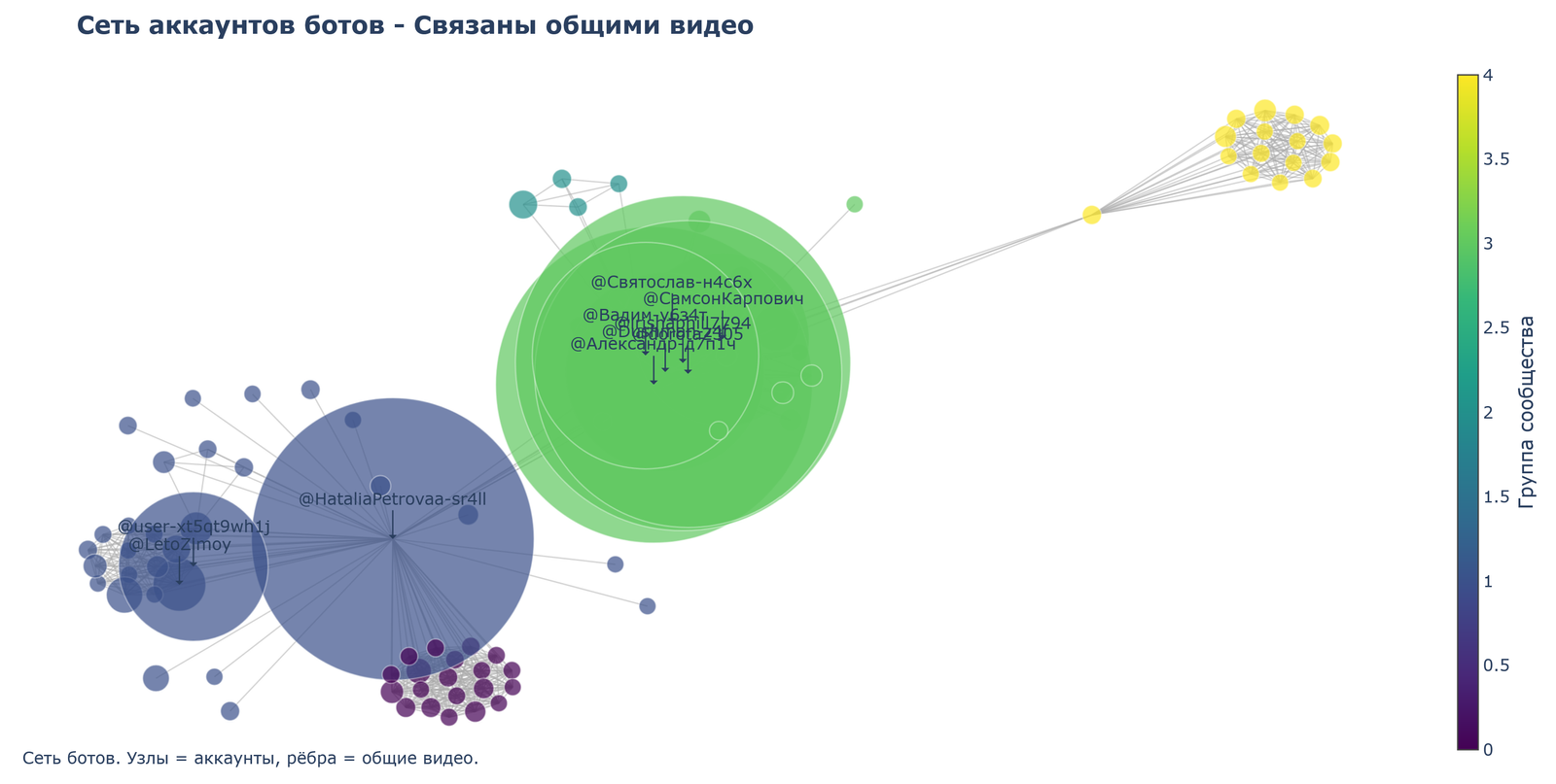 Визуализация сети демонстрирует минимум четыре хорошо выраженных кластера (синий, зеленый, желтый и фиолетовый), которые функционируют как координированные группы, комментирующие одни и те же видео. Ключевые аккаунты, занимающие центральное положение в сети, распределены между кластерами. В синем кластере выделяются такие аккаунты, как @NataliaPetrovaa-sr4ll, @user-xt5zt9whLj и @Leto2jmoy. В зеленом кластере центральную роль играют @Святослав-n4c6x, @СвмсонКарпович, @Вадим-yb34lj, @PiterFan117j94 и @Александр-j47t1c.
