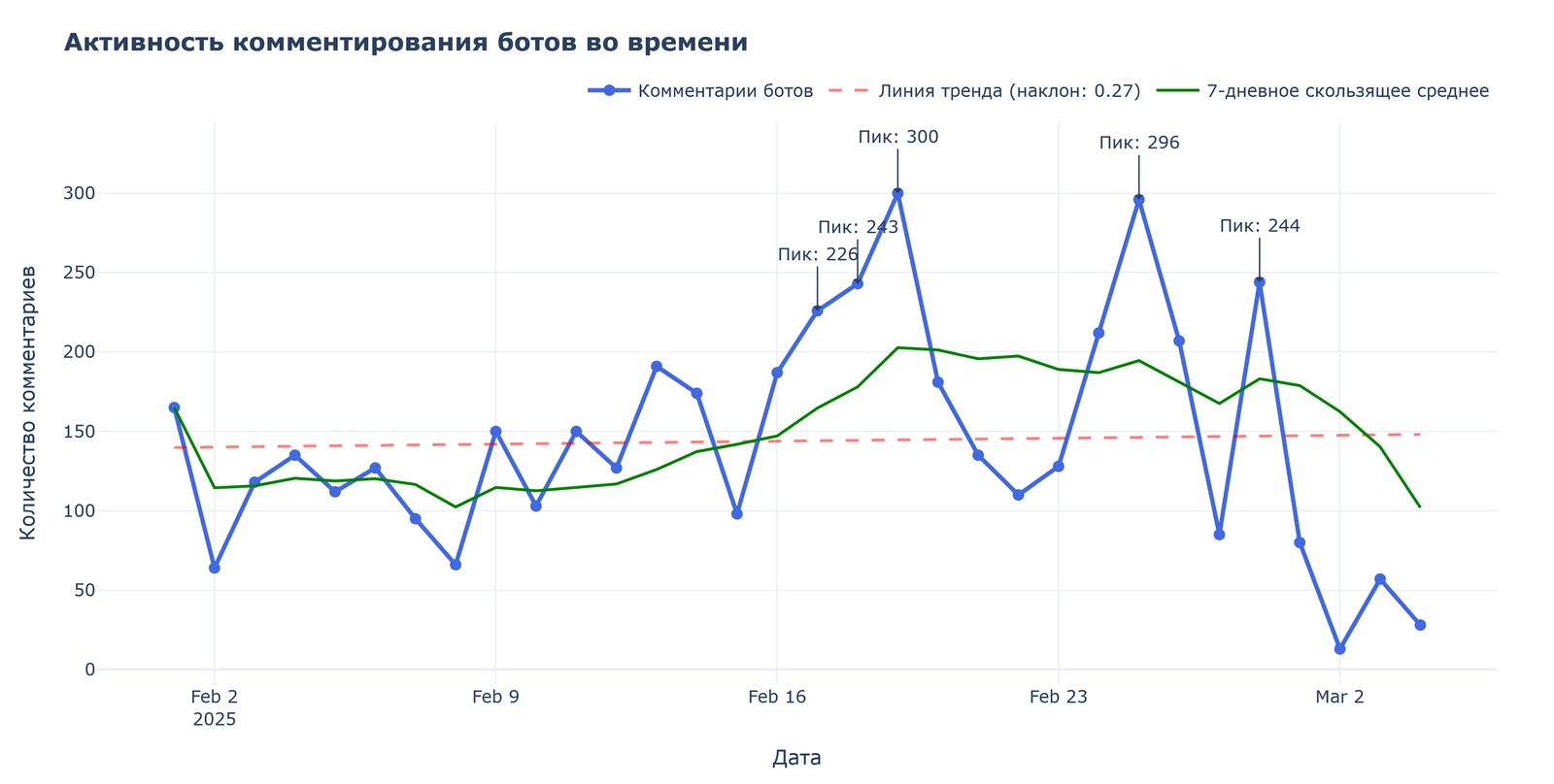 В феврале 2025 года зафиксированы четыре основных пика активности: 17 февраля (226 комментариев), 18 февраля (243 комментария), 19 февраля (300 комментариев, наивысший пик) и 25 февраля (296 комментариев). Дополнительный пик отмечен 1 марта (244 комментария). После этого наблюдается резкое падение активности в начале марта, что может указывать на завершение информационной кампании или смену тактики.