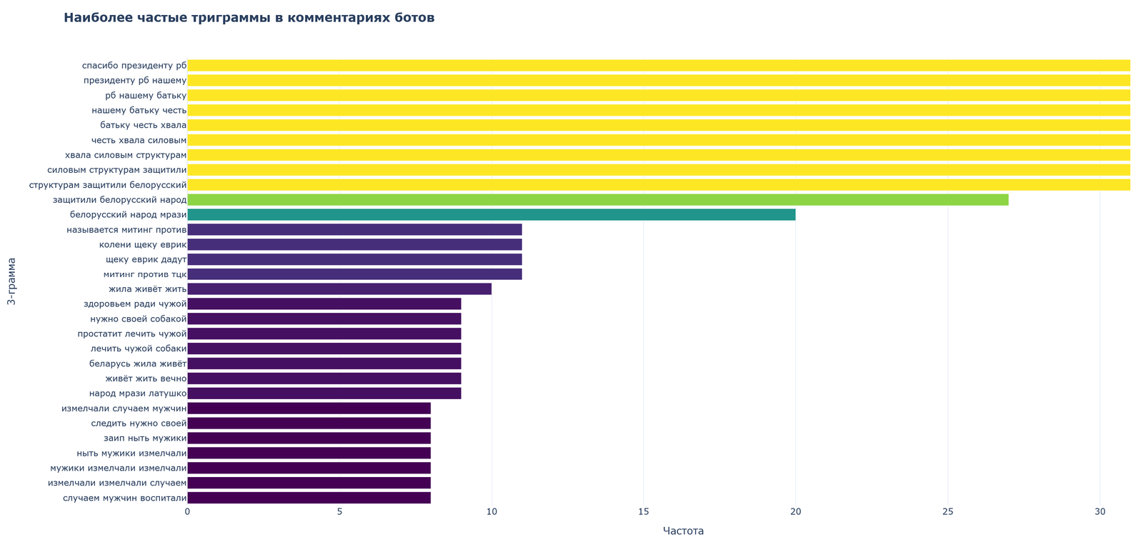 Особенно показательным оказался анализ триграмм (последовательностей из трех слов), демонстрирующих использование шаблонных конструкций для массового комментирования.