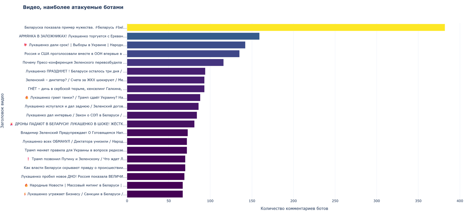 Анализ целевых видеоматериалов показал, что боты преимущественно атакуют видео о гражданской активности. Абсолютным лидером по количеству комментариев ботов стало видео «Беларуска показала пример мужества» (около 400 комментариев).
