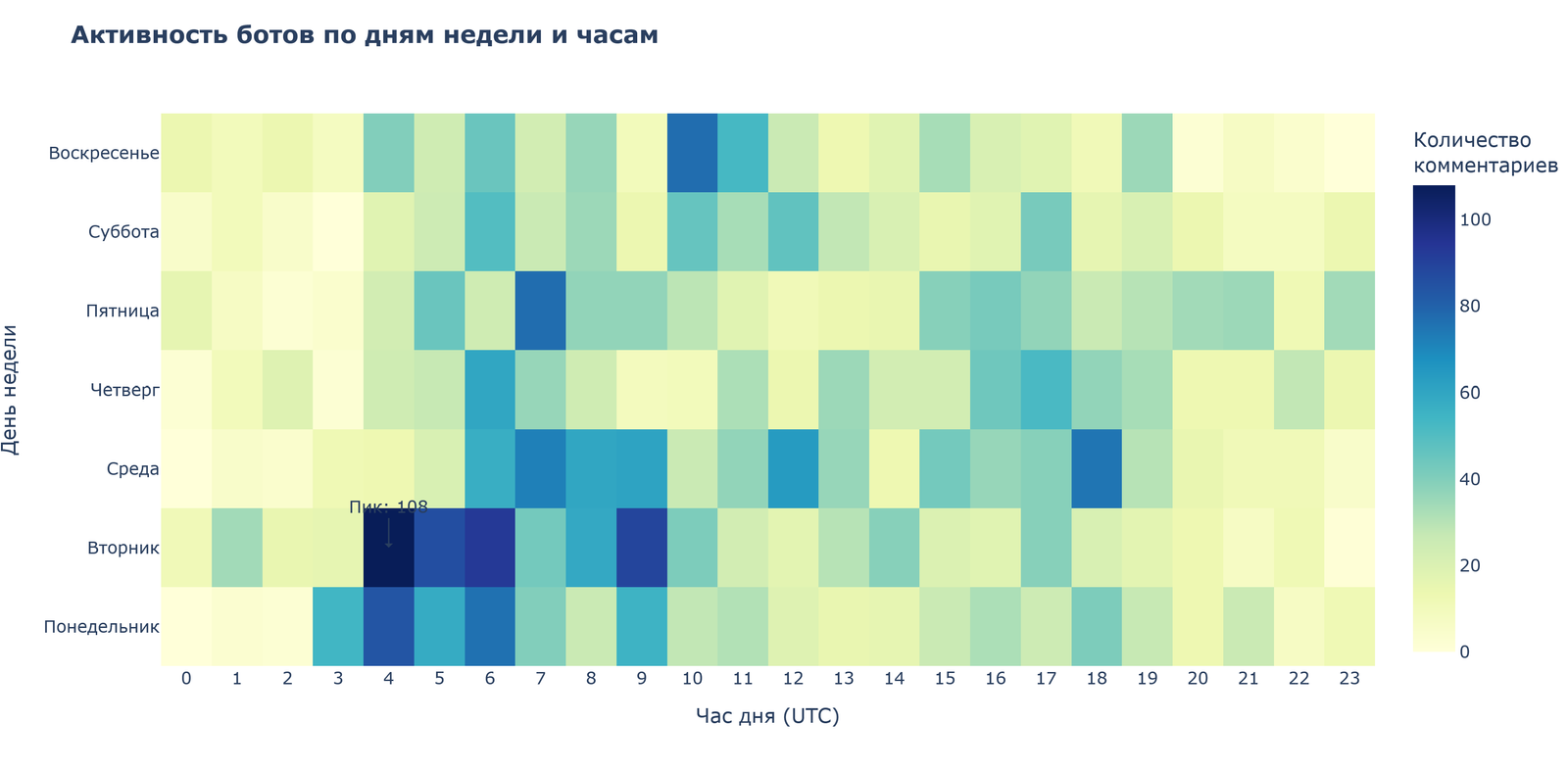 Анализ временной активности ботов выявил четкие паттерны, свидетельствующие о координированном характере операции.