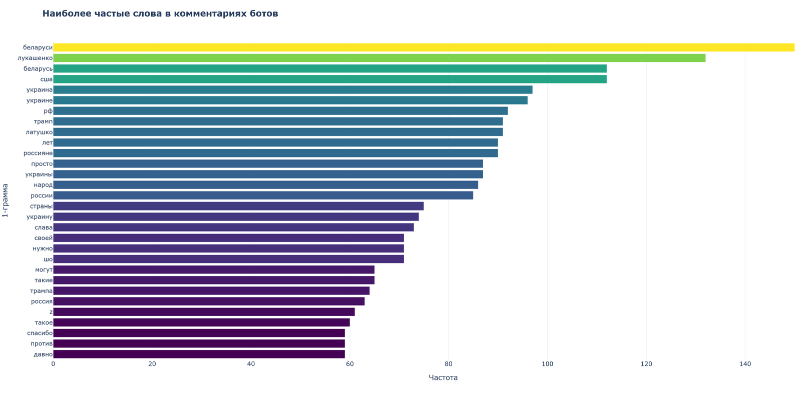 Анализ лексики, используемой ботами, показал четкие тематические направления и нарративы.