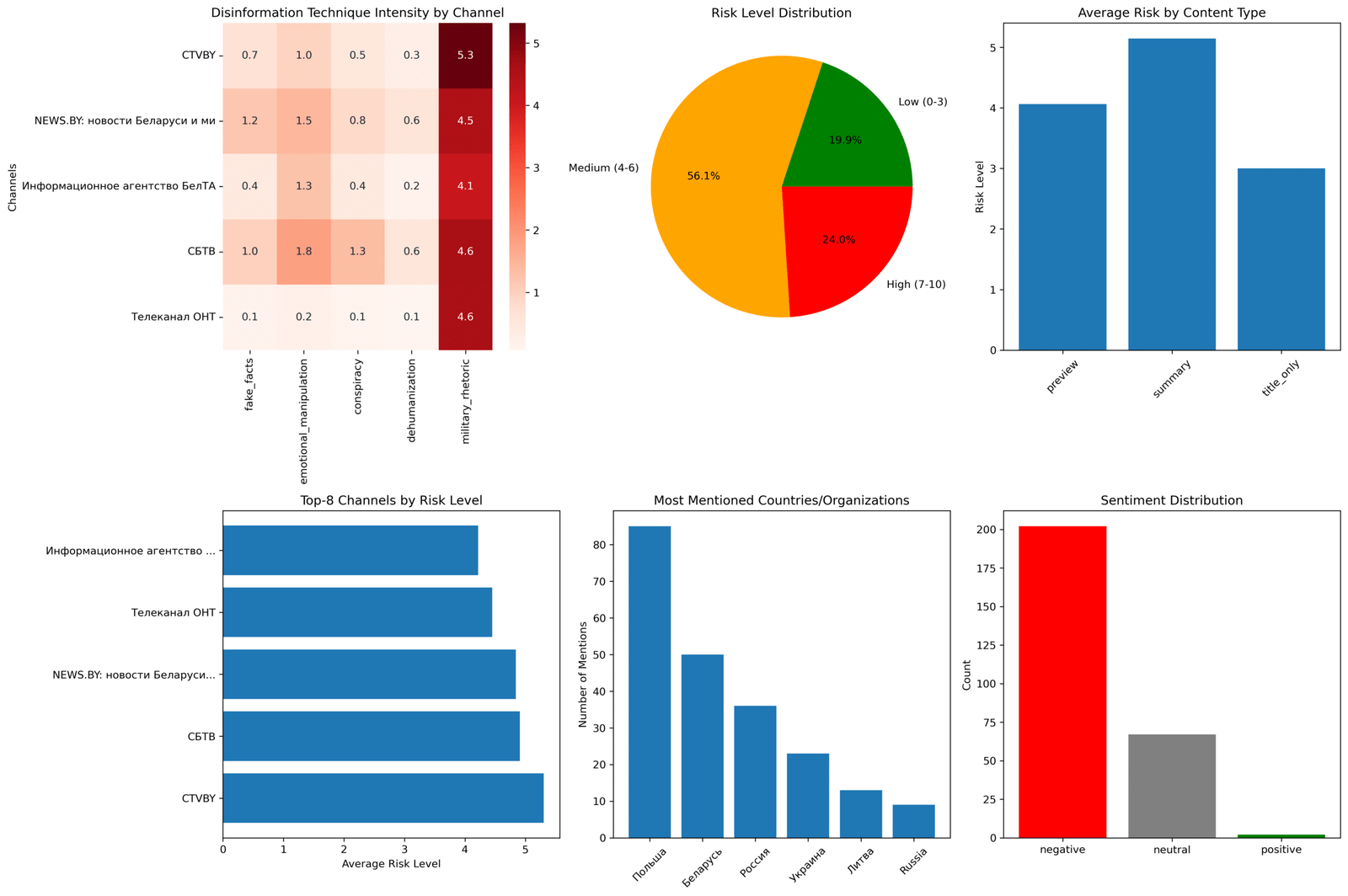 Анализ уровней риска показывает тревожную картину: 38,1% материалов классифицированы как высокорисковые (7-10 баллов), что составляет наибольшую долю. Средний уровень риска (4-6 баллов) составил 36,1%, в то время как низкорисковый контент занял лишь 25,7%. Эта пирамидальная структура, перевернутая в сторону высокого риска, указывает на преднамеренную стратегию информационного воздействия, а не на случайные погрешности в журналистской работе.